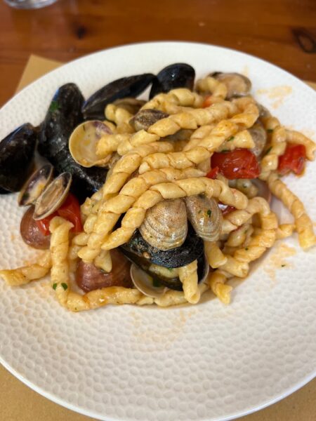La cucina è tipica del posto, il pesce freschissimo è proveniente direttamente dai pescherecci che riforniscono la zona.