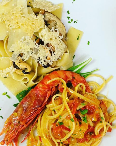 Tra i primi piatti troviamo gli spaghetti con gamberetti e limone.
