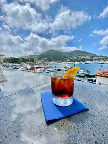 La terrazza si affaccia sul porto di Ischia regalando aperitivi e cene d’estate privilegiate grazie agli splendidi tramonti.